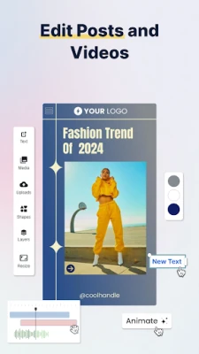 Use the editor to make quick changes to posts and customize Templates. Add logos, images, texts, fonts, shapes, illustrations, videos, stickers, animations, resize post, switch colors and templates. Use the background remover to remove background from your photos and product images.